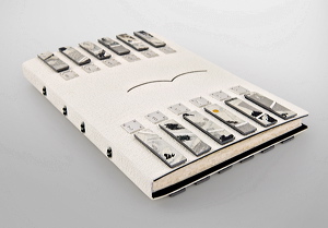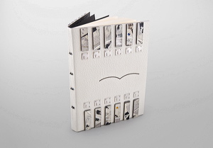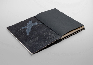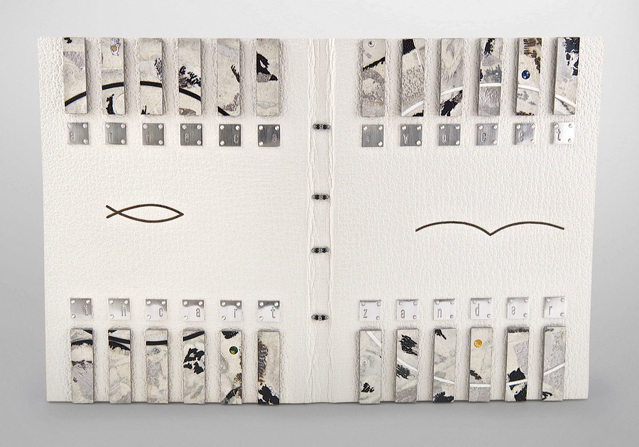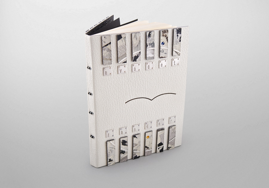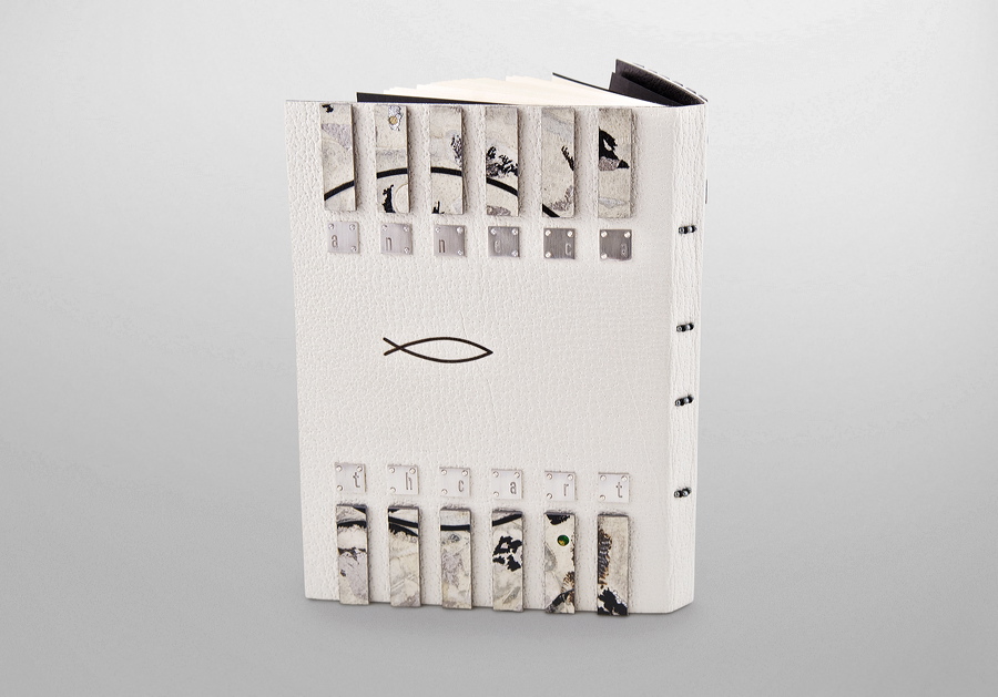 ![]() Raised 'lacunose' panels (PVA-impregnated/sanded leather collage). Title (front) and author's name (rear) debossed in squares of silver attached with sewn glass beads. |
