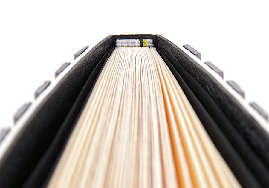 ![]() Two-stage sewing; first stage, textblock only; second stage through cover and glass beads. |